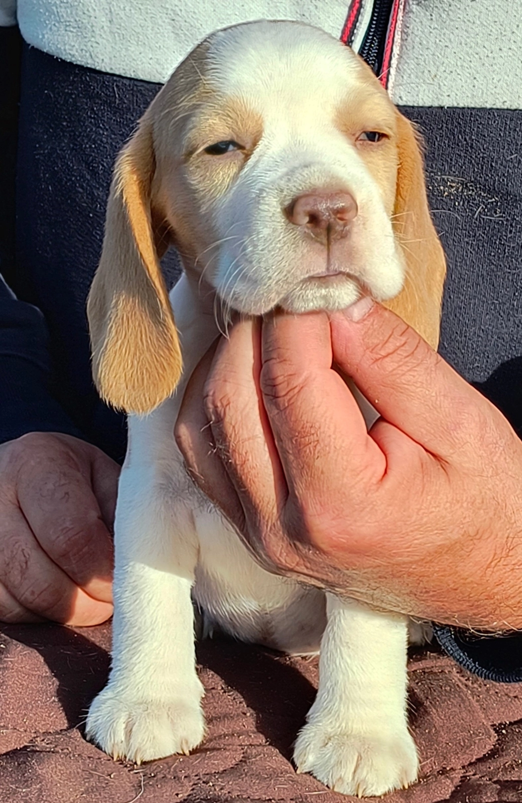Flower is a lively and playful Beagle, showing off her natural curiosity and confidence from an early age. At just six weeks, she’s already mastering the art of standing on the table and impressing us with her poise. She comes from a litter of 4 male 2 female.