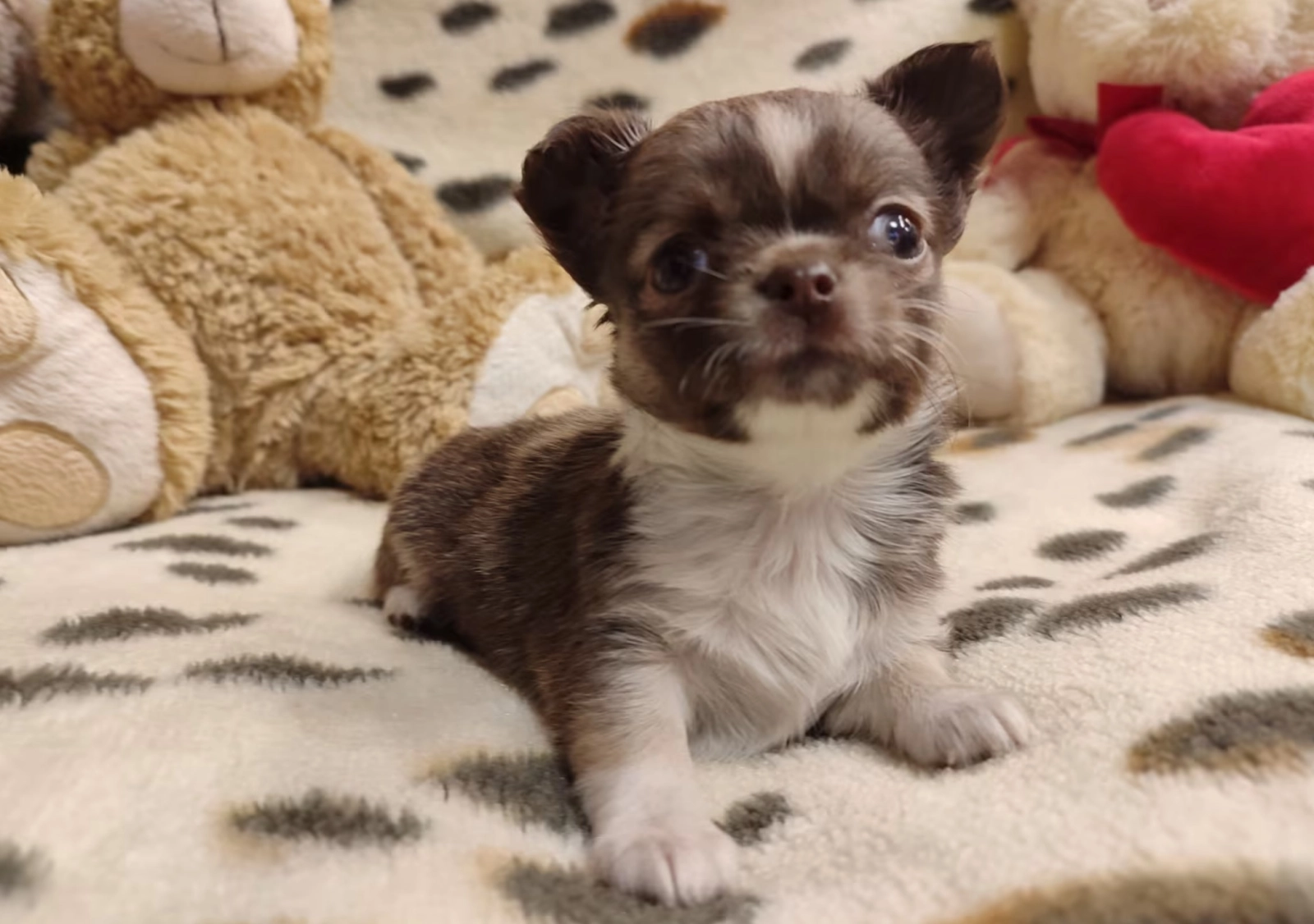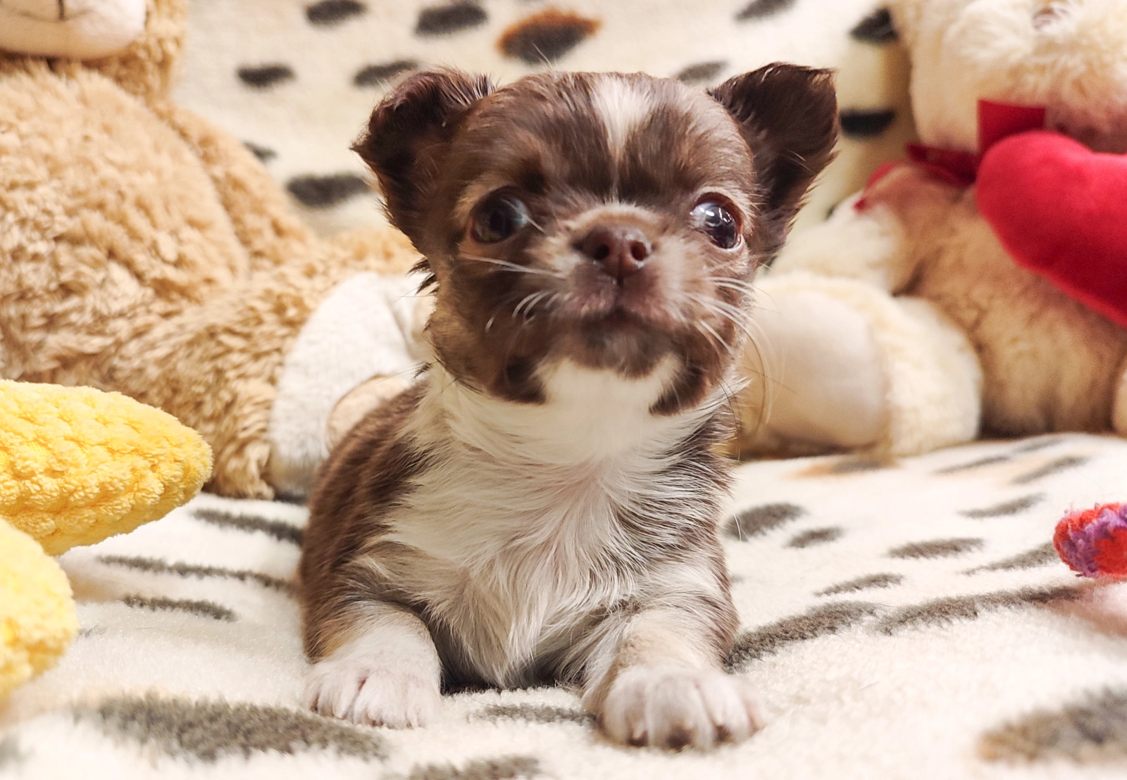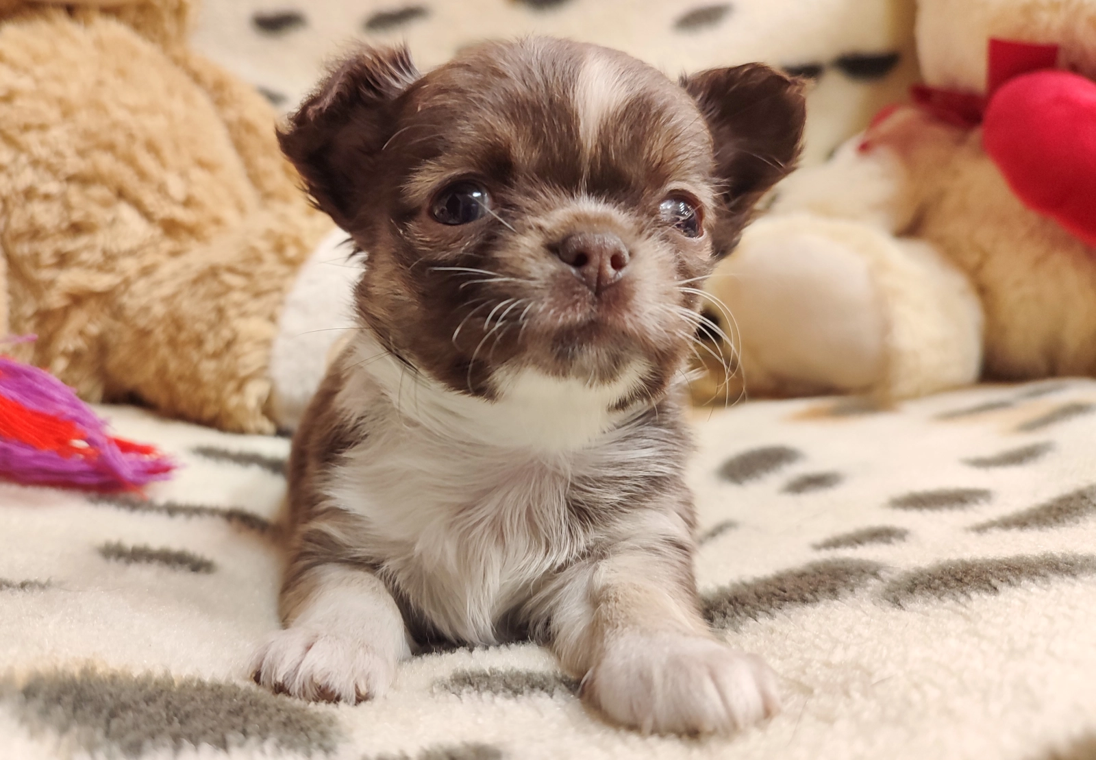 Meet Ren, an adorable female Chihuahua with a beautiful chocolate and tan coat. Ren stands out with her long, silky fur, which makes her even more charming and cuddly. Both of her parents are free from patella luxation, ensuring Ren starts her life healthy and strong. Her sire is a fawn, and her dam is a lovely chocolate and tan, which makes for a stunning combination in this little girl.
